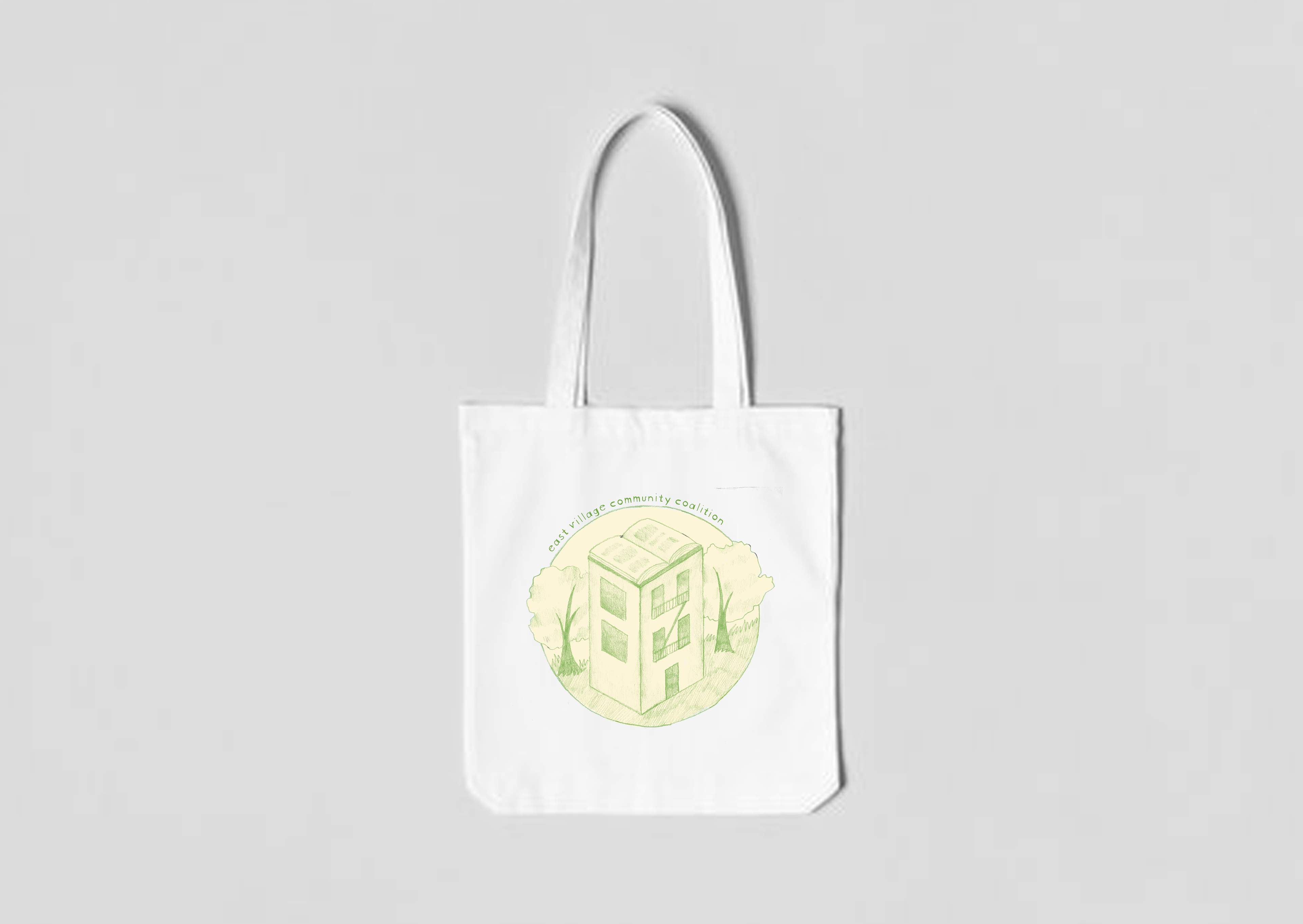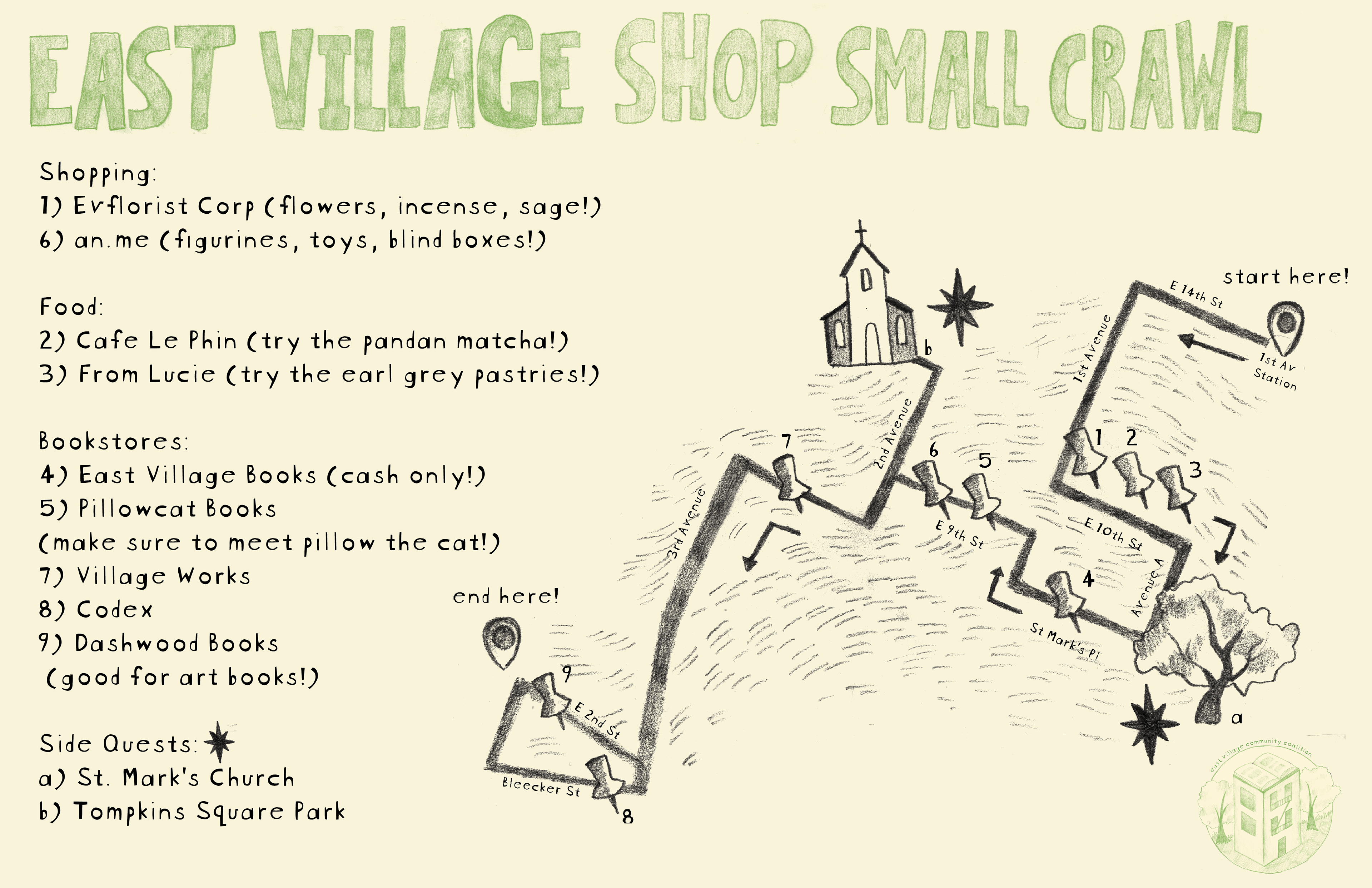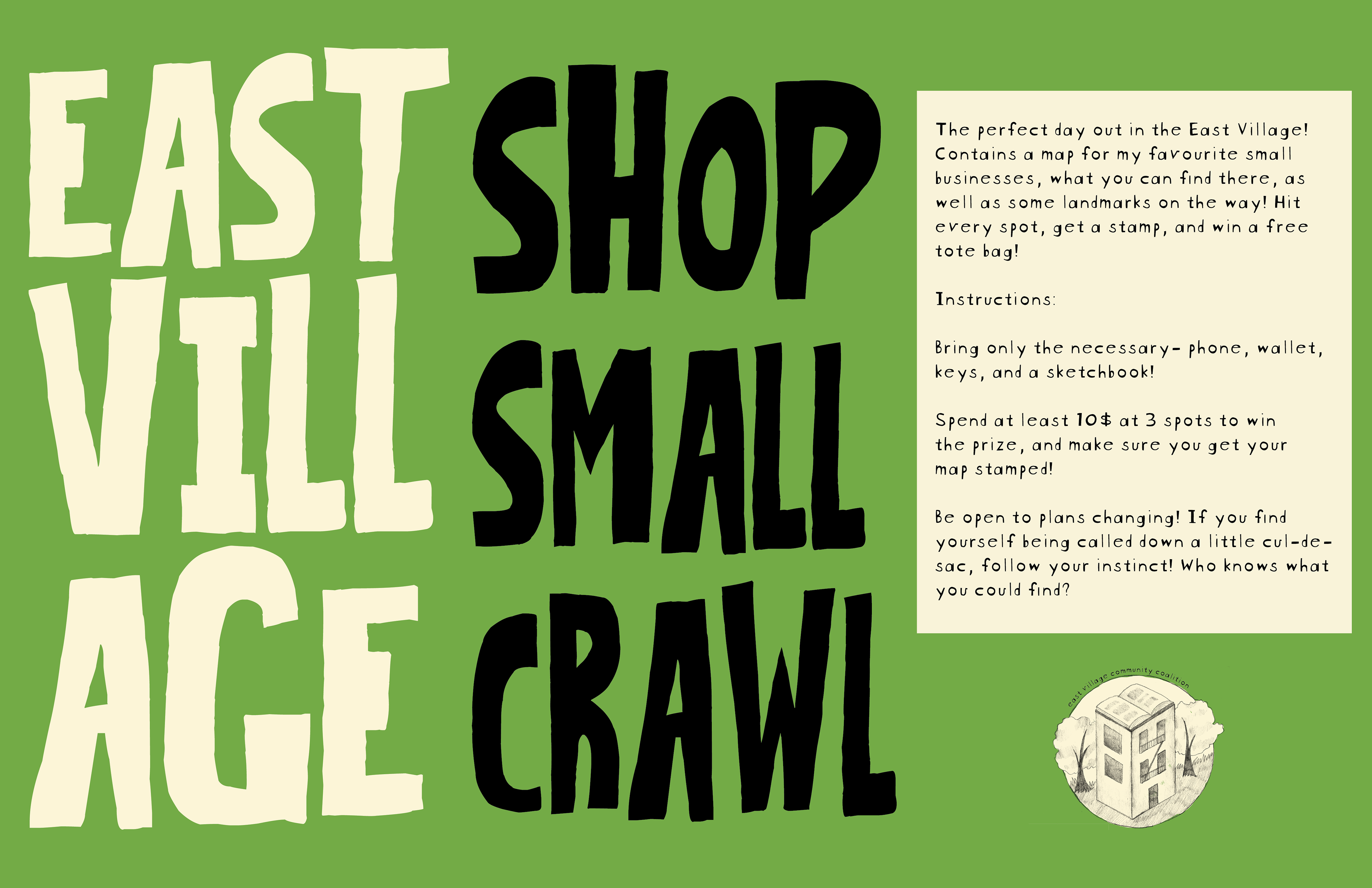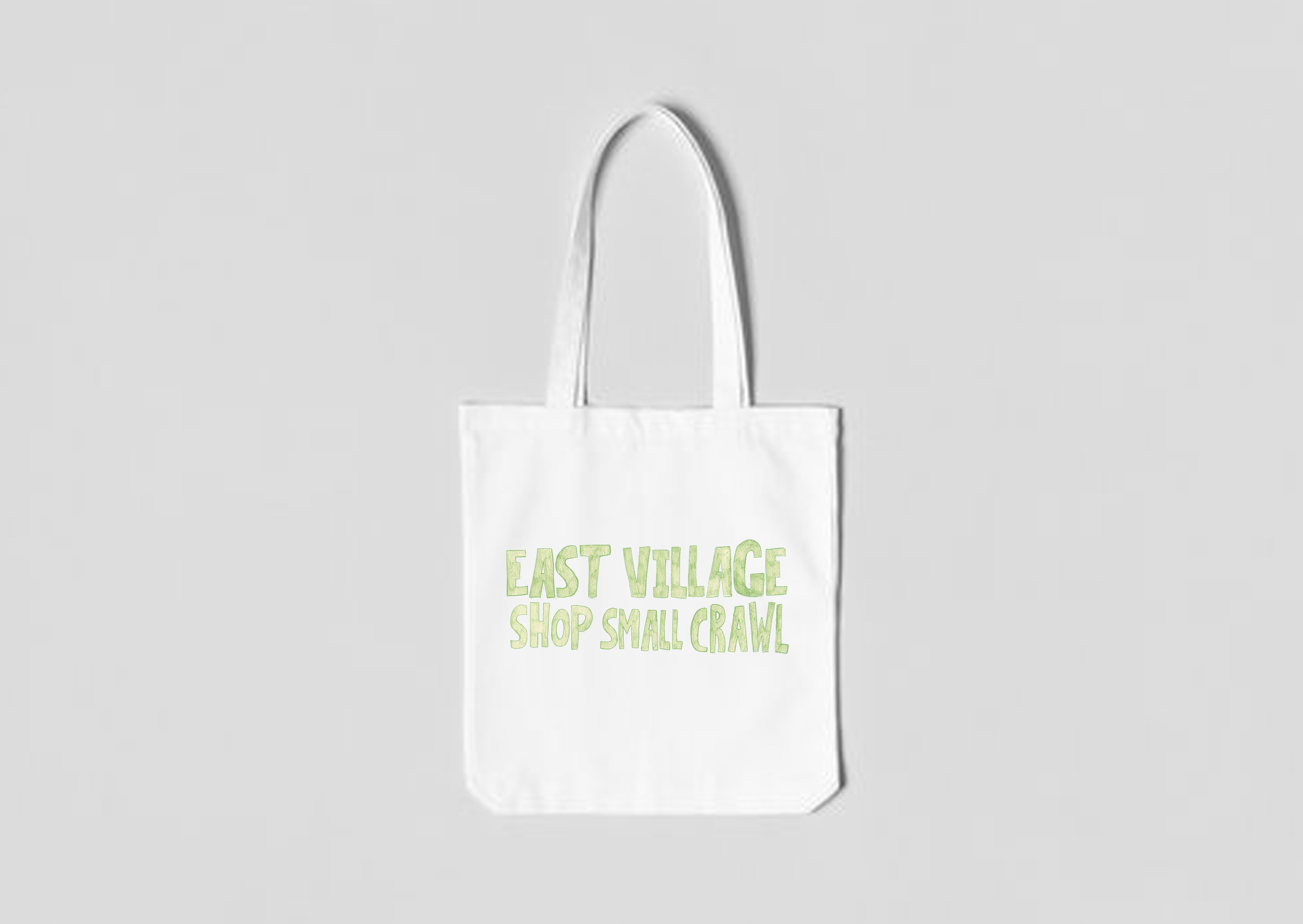 A map designed for a speculative East Village Small Business Crawl, along with mockups of merch and logo design.
